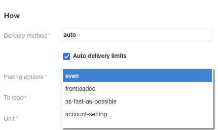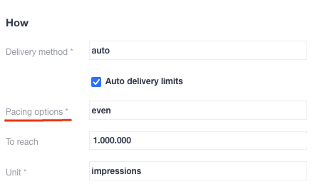 When you select Auto as the delivery method on the booking screen, the Pacing Options option will appear. These options determine how many impressions of the booking will be delivered during the first half of the delivery period.