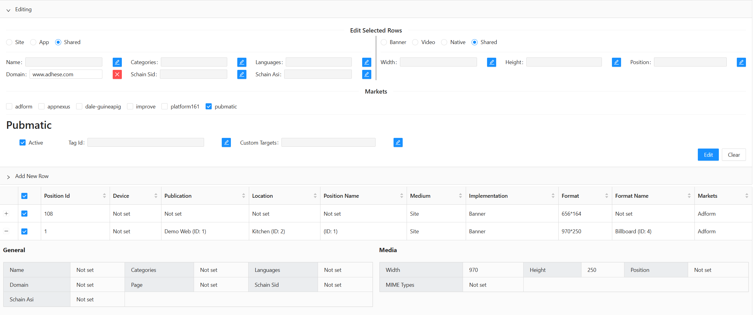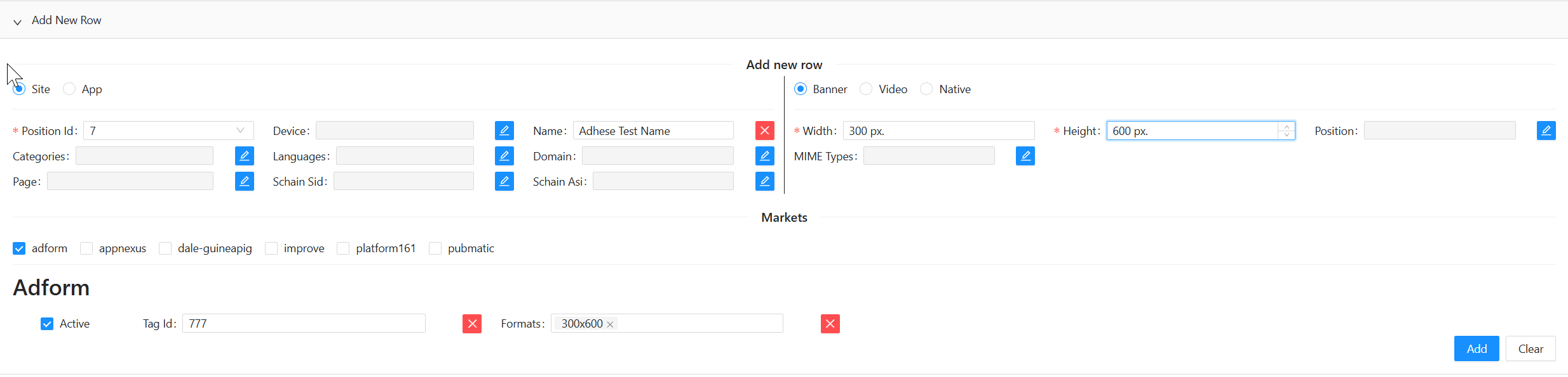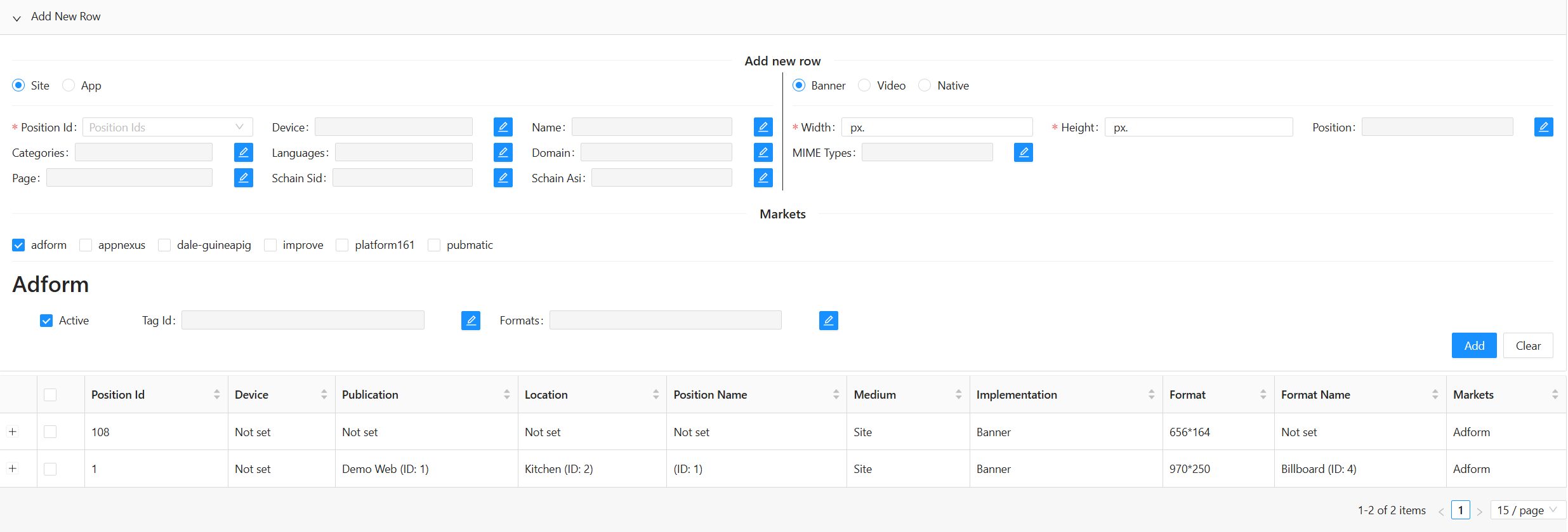 - Each new row must include at least one market instance. If adding a row with an existing position ID, ensure device type and content type differ from the original.