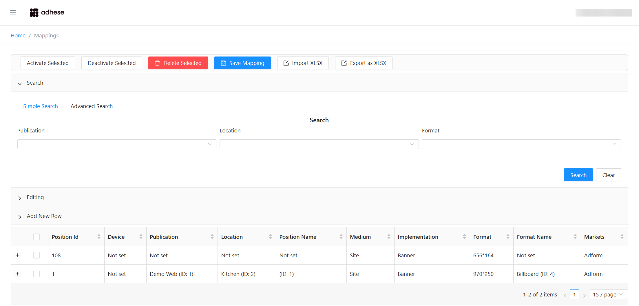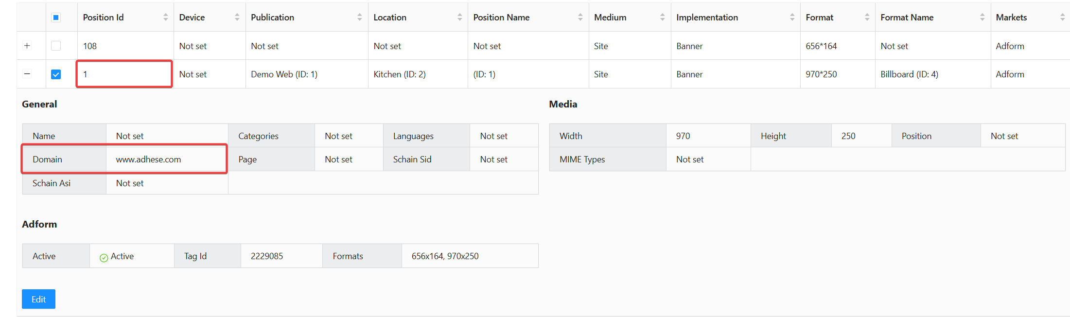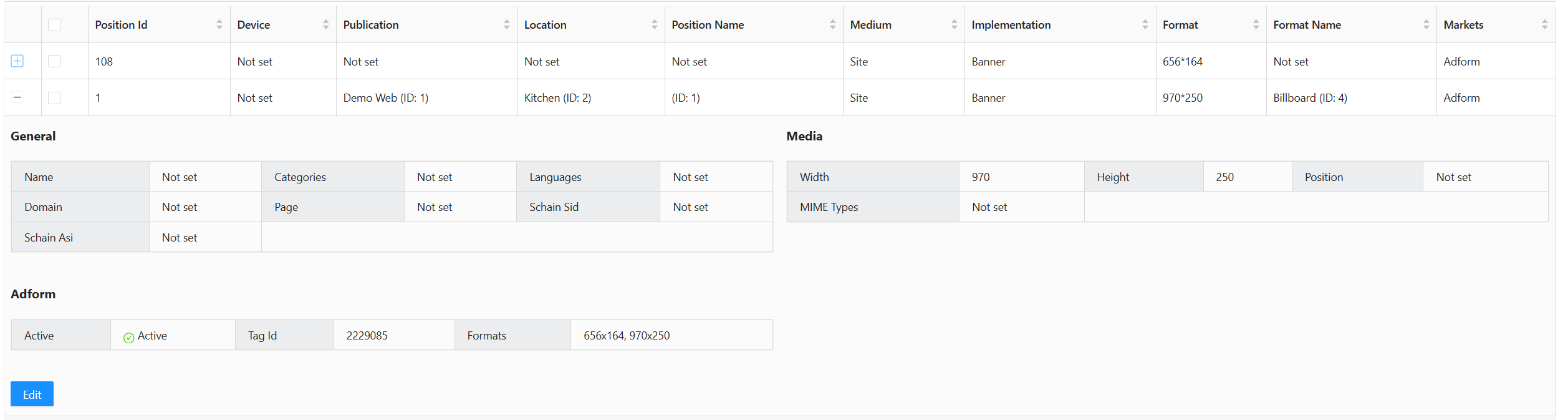 - Each new row must include at least one market instance. If adding a row with an existing position ID, ensure device type and content type differ from the original.