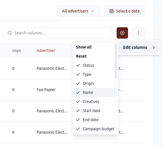 At the top right, you can select the advertiser whose campaigns you want to see exclusively. At the bottom, you can select Show all advertisers to undo previous selections.