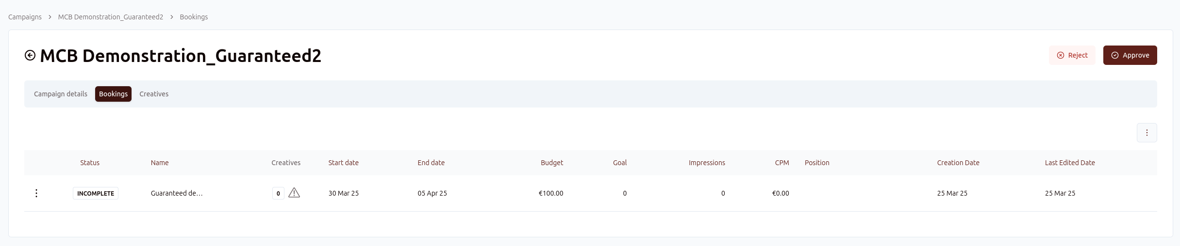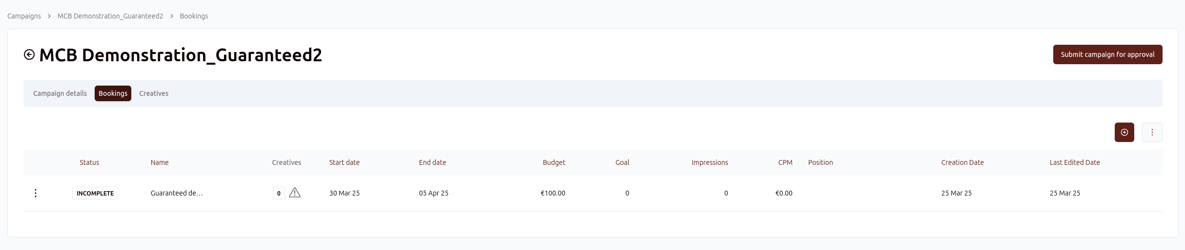 The guaranteed campaign workflow is slightly different from the auction campaign workflow. While only creatives need to be approved for auction campaigns, guaranteed campaigns themselves need to be submitted for approval. From the guaranteed campaign booking screen, you can submit the campaign for approval: