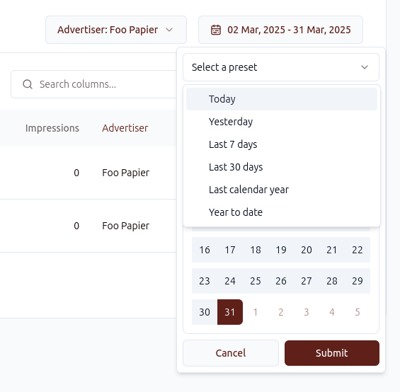 All campaigns running at any time within the selected period will be displayed. You can also select preset periods to filter campaigns: