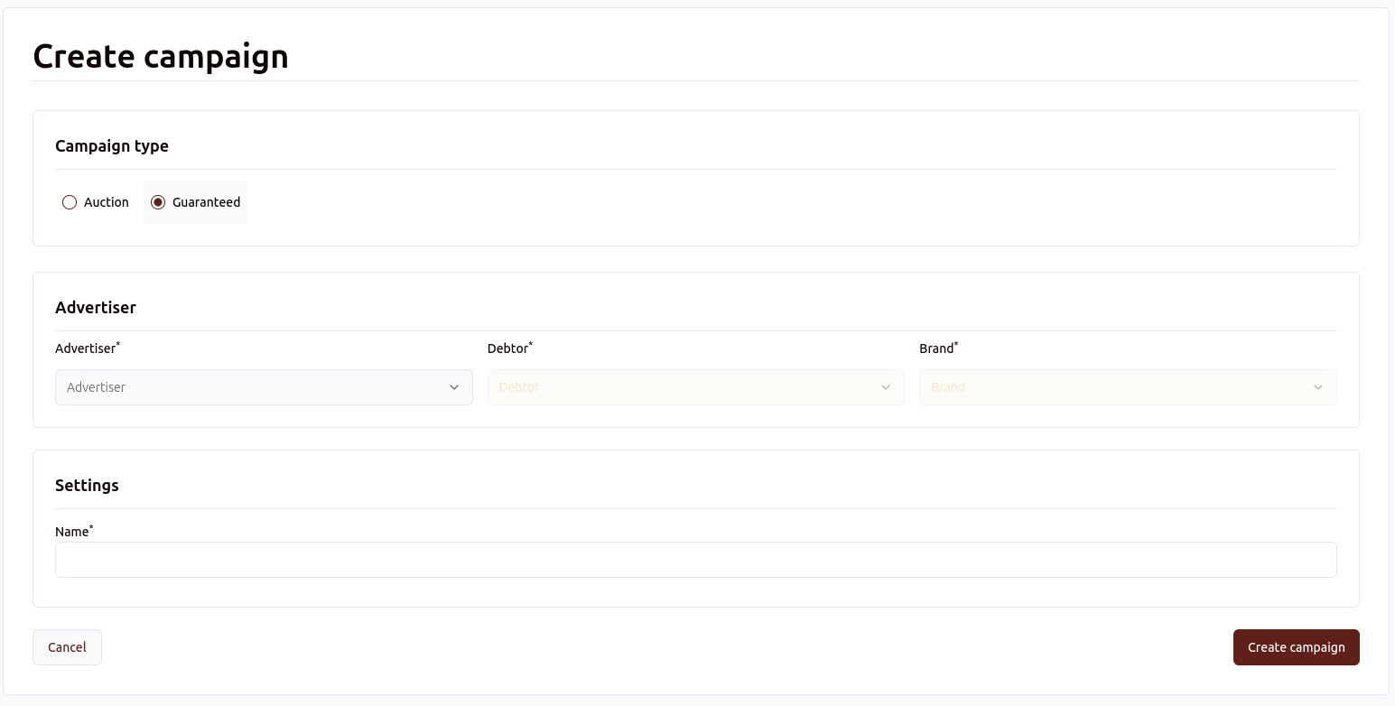 Both campaign types must have an Advertiser, Debtor and Brand filled in. Both campaigns also require a campaign name.