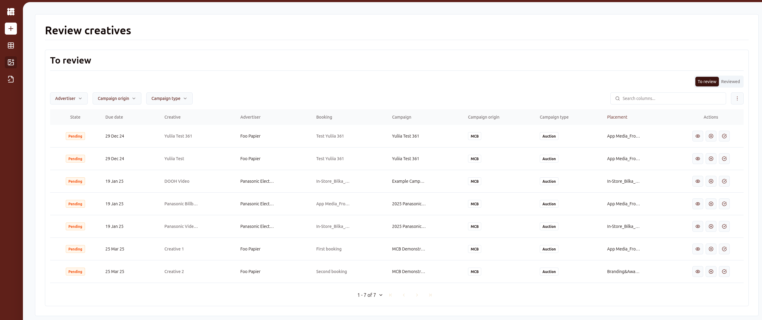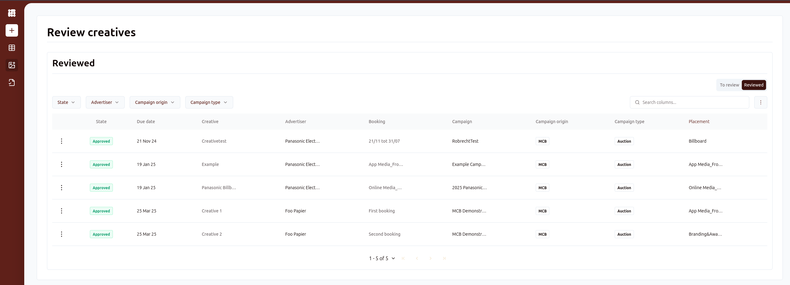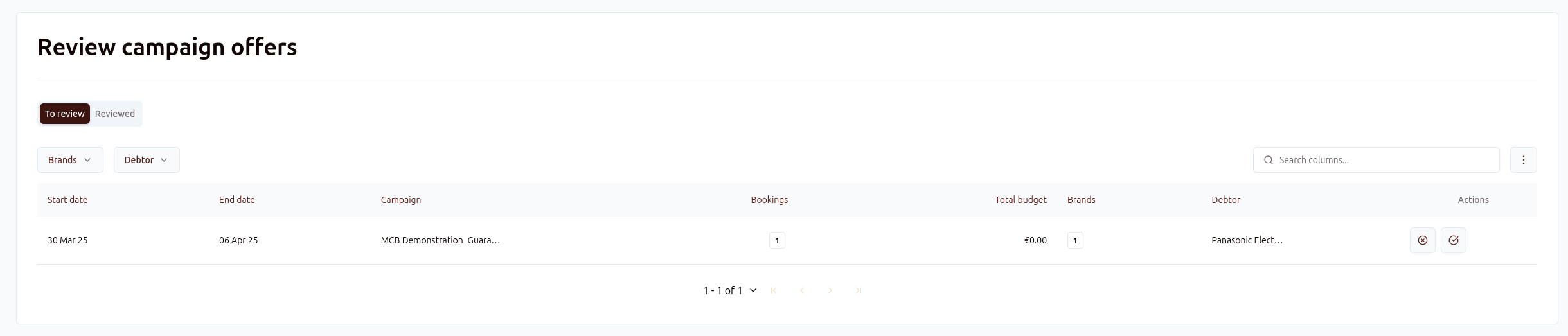 If you have the appropriate rights, you can approve a campaign from this menu or from the Booking tab of the campaign in question. Otherwise, you will only be able to view the campaigns that have not yet been reviewed and the campaigns that have been reviewed: