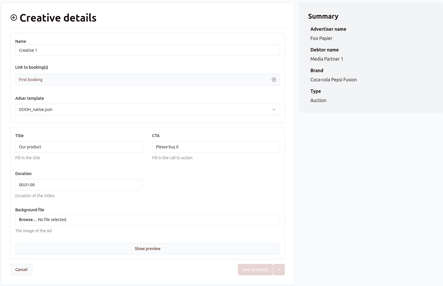 Once everything is filled in, you can click the Save & Submit button. Alternatively, you can click the arrow to save the creative but approve it at a later stage.