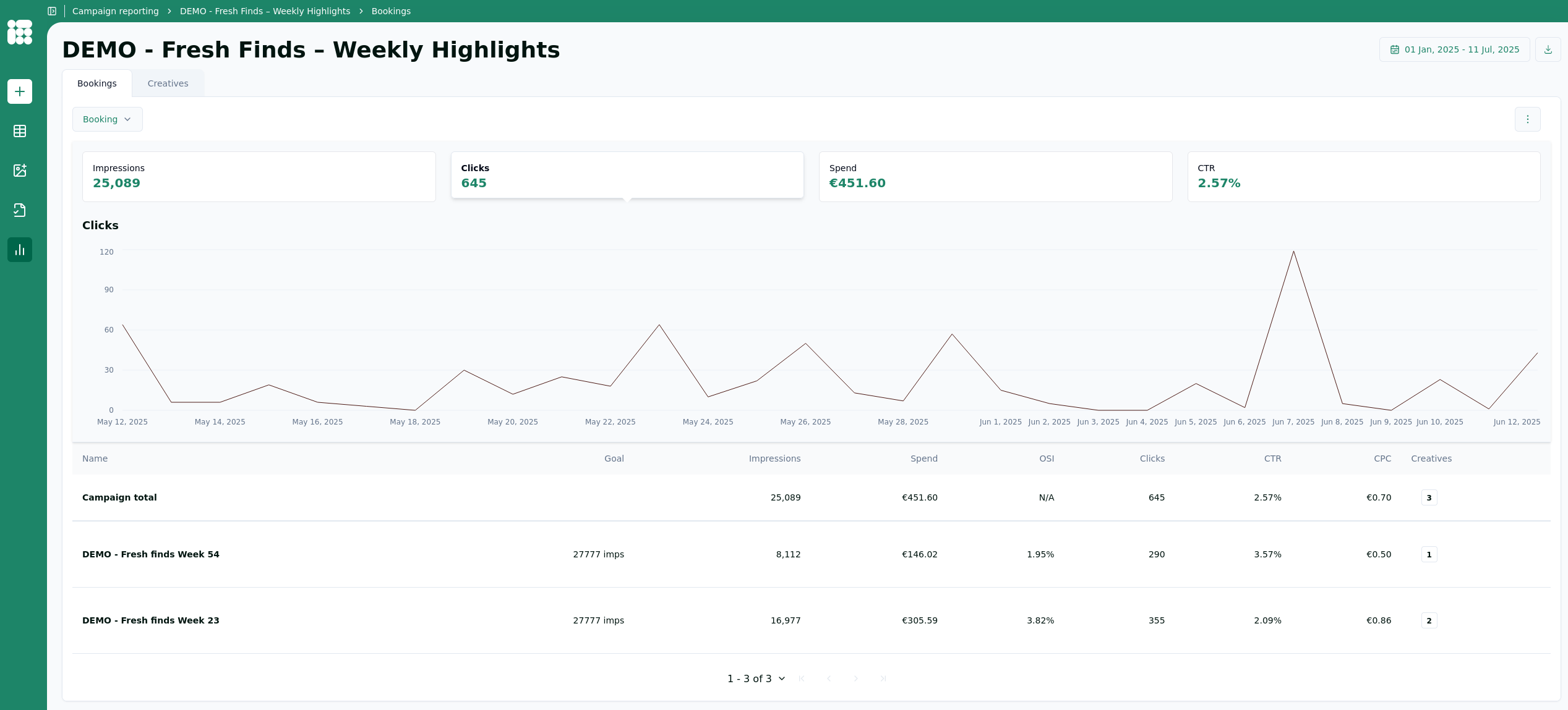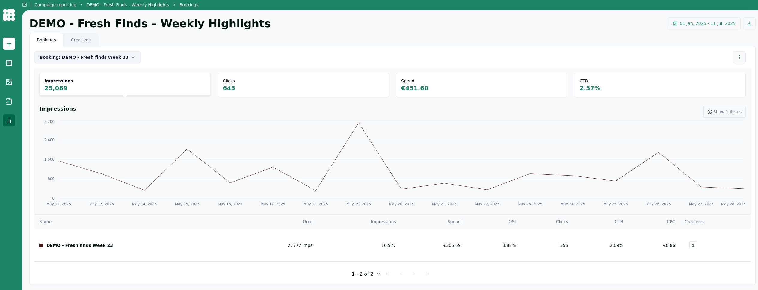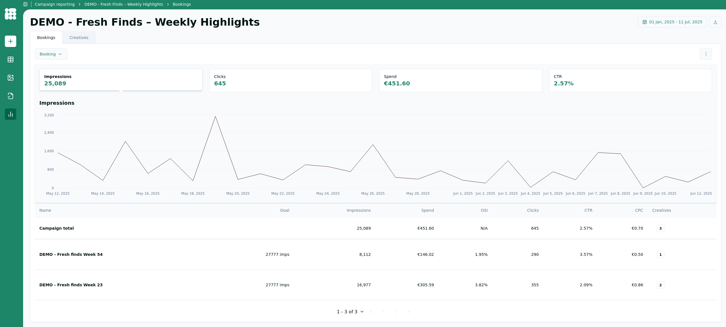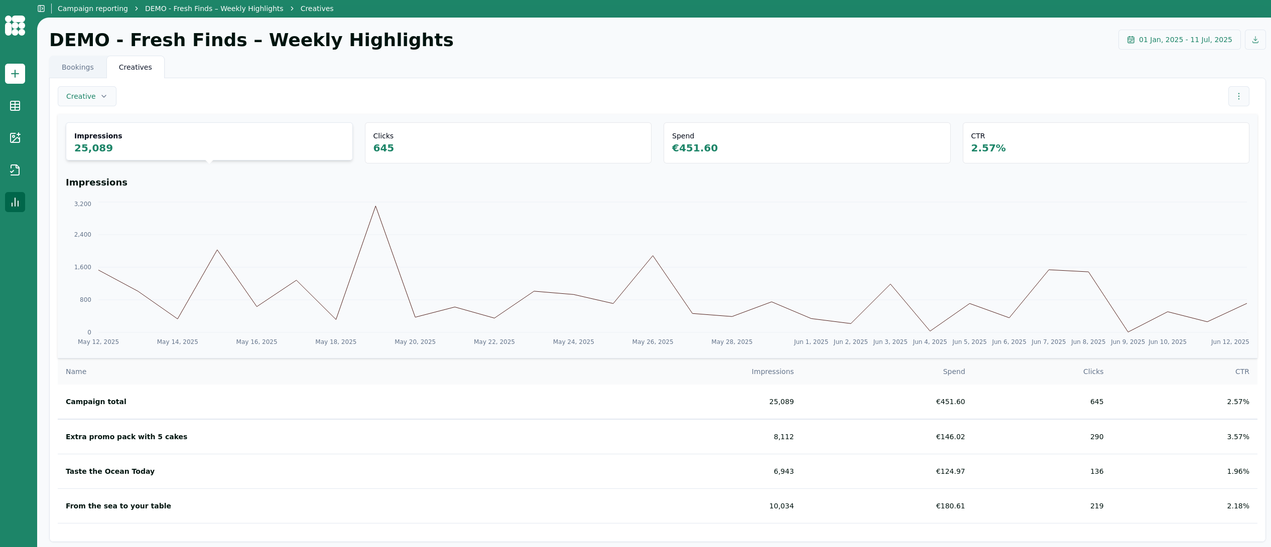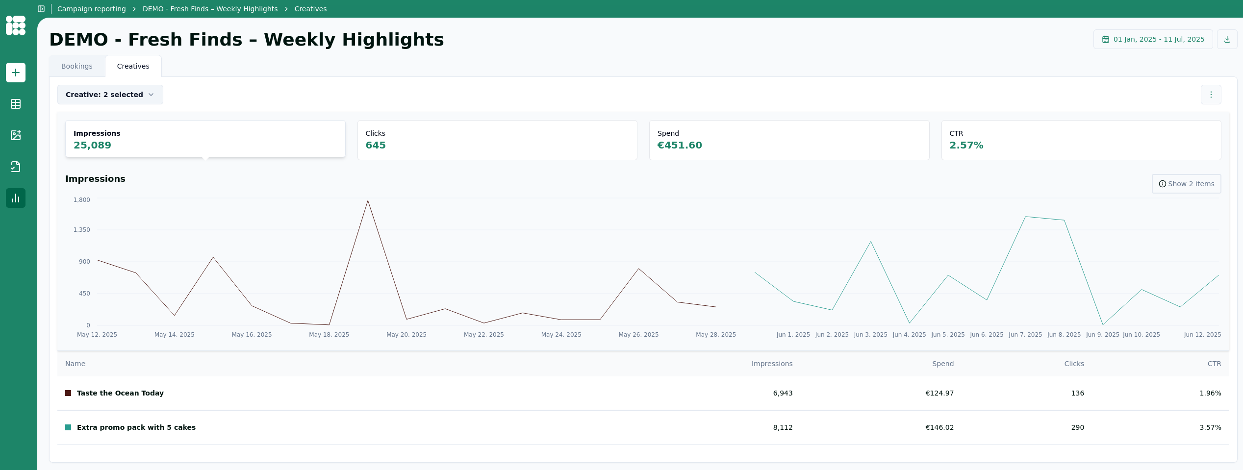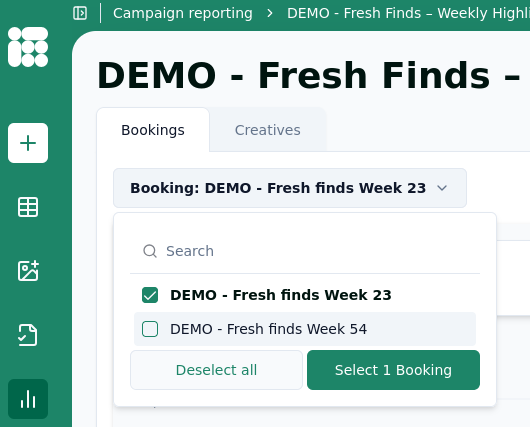 Campaign, booking and creative reporting can be found in the campaign reporting tab:
