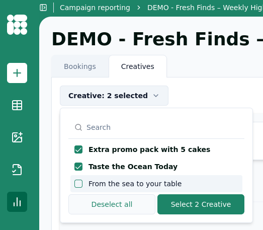 The creatives report is structured similarly to the booking report. You can filter the report based on one or multiple creatives: