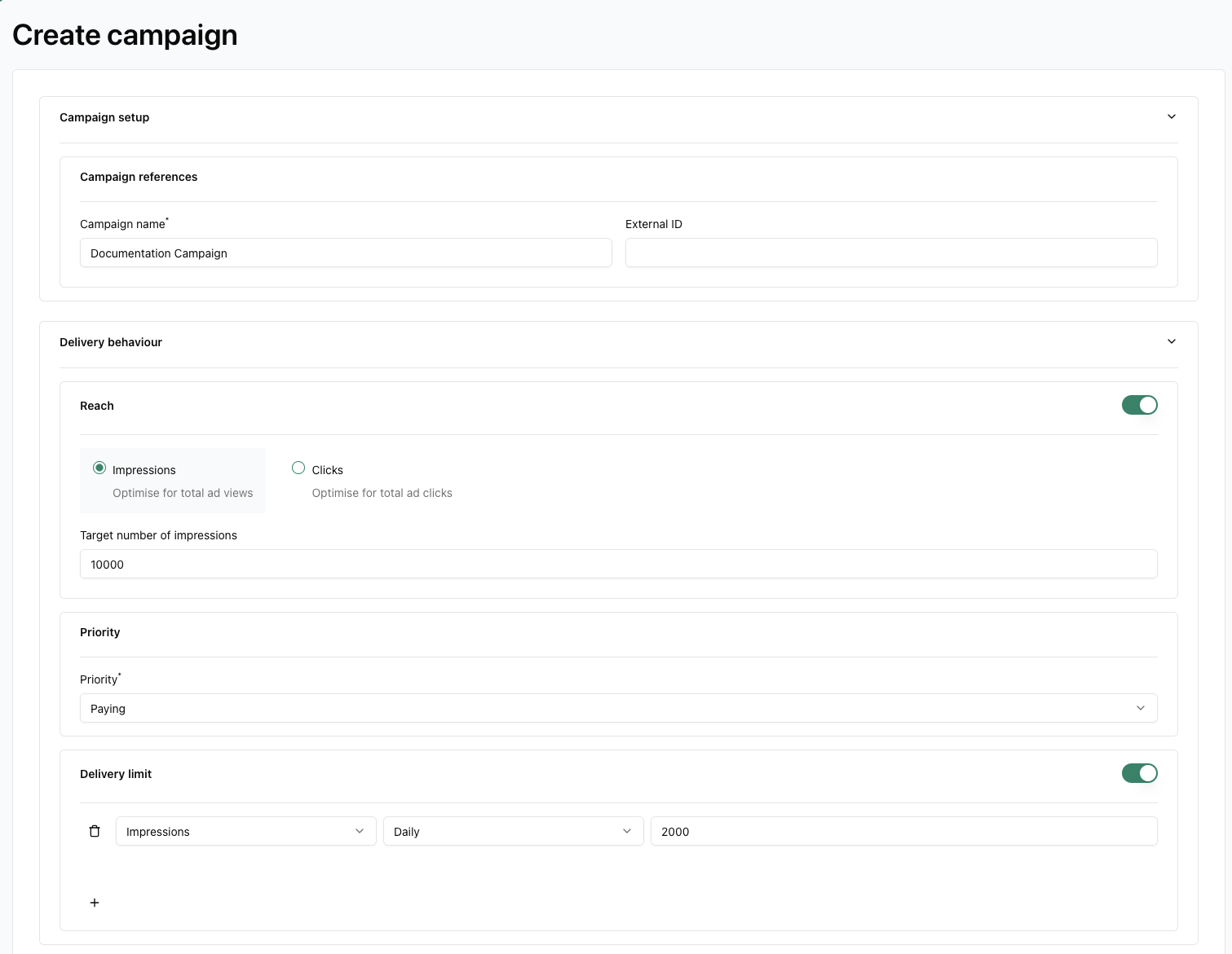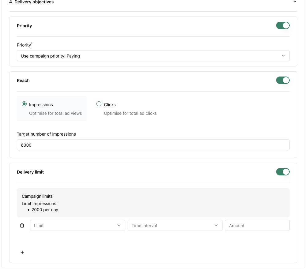 - Delivery limit: You can set a delivery limit in impressions or clicks, daily or hourly. You can add more limits by clicking on +. You can delete a limit by clicking the trash can icon to the left of the limit. The option needs to be toggled before it can be used.
