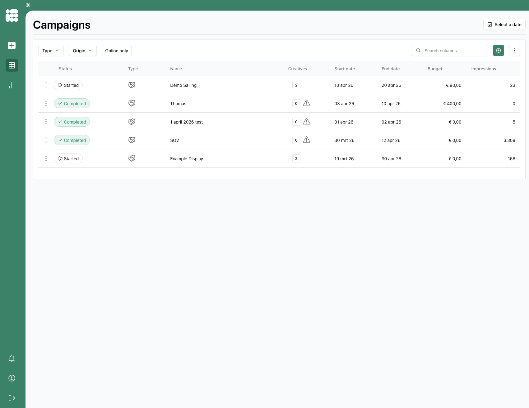 When you log into Adhese using the Campaign Manager interface, the first thing you will see is the Campaigns screen: