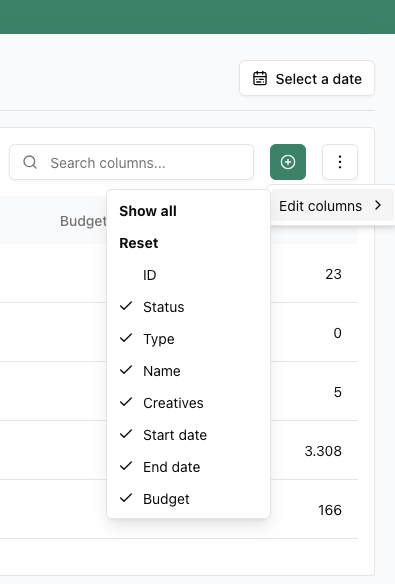 The Campaigns screen lists campaigns and several columns of information about those campaigns. The columns can be customised, and columns can be selected and deselected: