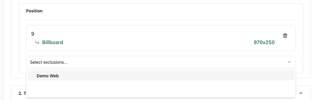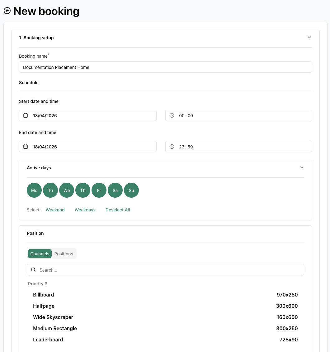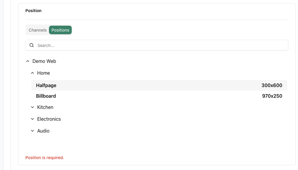 - Position: You can select either channels or individual positions. Channels are sorted per format, while positions follow a publisher>publication>position format.