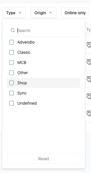 Next to the Type filter is the Origin filter. Here, you can see which platform the campaign was created on or pushed from. Options include MCB, Classic, Advendio and more