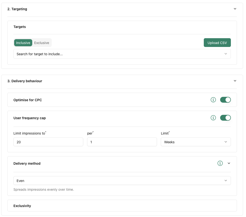 - Targets: You can select inclusive (the target must be present in the request for booking to deliver) or exclusive (the target must not be present in the request for booking to deliver). You can also upload a CSV file with target IDs in a single column to bulk activate targets. If you want to use this option but are not sure how, please contact support.