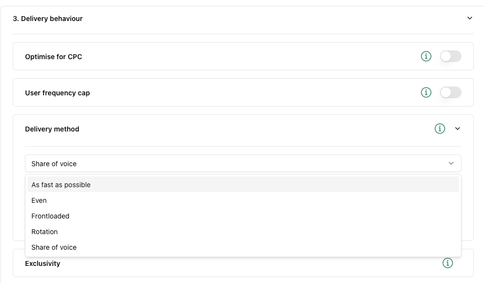 - Delivery method: Here, you can decide how the booking will be delivered. Even, Frontloaded and As fast as possible are options in which Adhese calculates delivery based on forecasting, with varying amounts delivered in the first and second halves of the booking period.