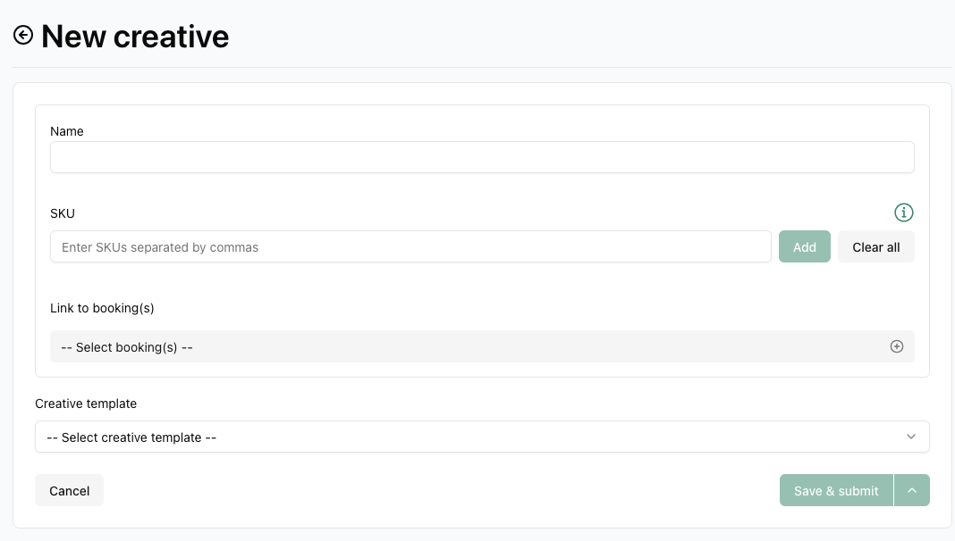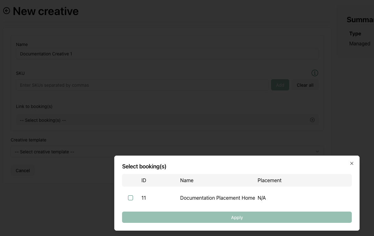 You can add a creative by clicking on Add creative In the next step, you can select the creative type, fill in the details and traffic the creative to a booking: