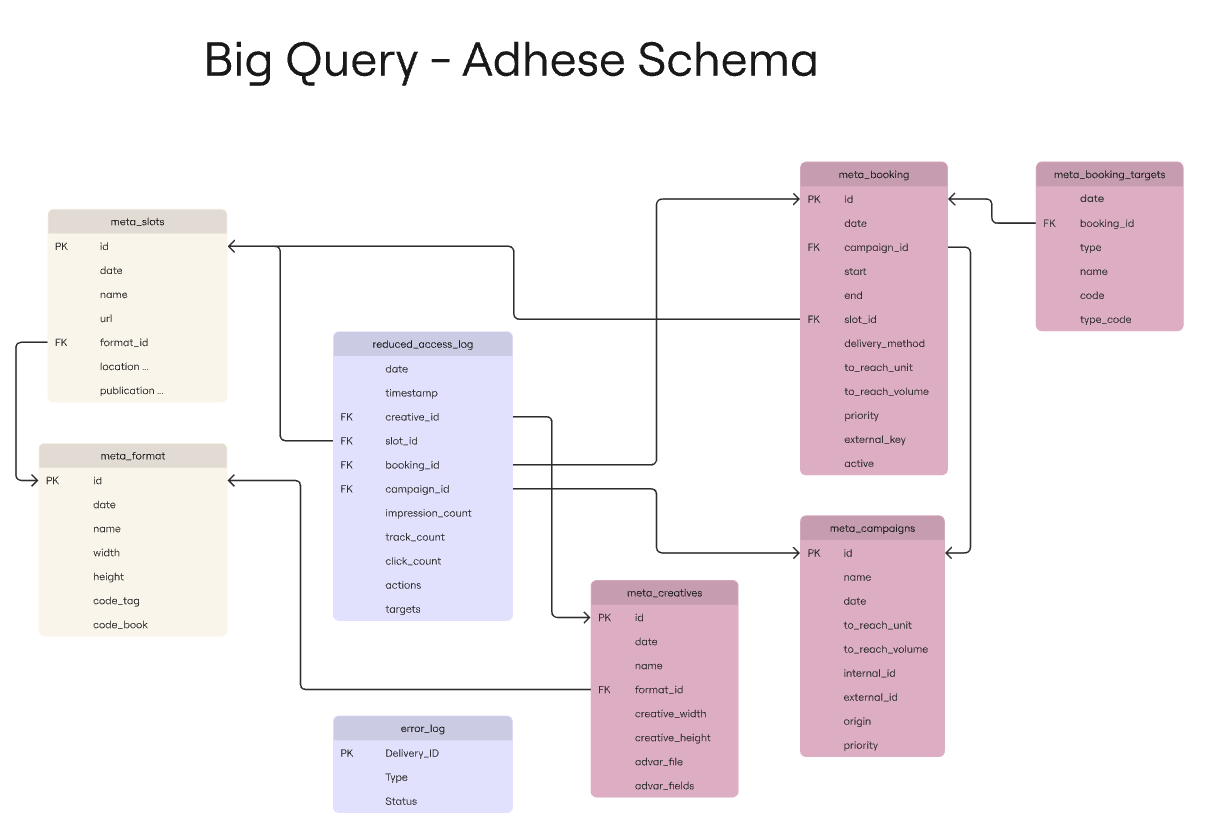 Adhese Gateway (GW) logs all actions taken while receiving a request from a device and returning a response milliseconds later. This data is made available to the Gateway users through BigQuery (BQ) tables that contain results per day and are updated at midnight.